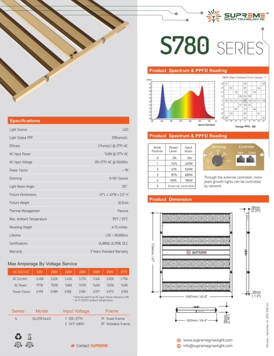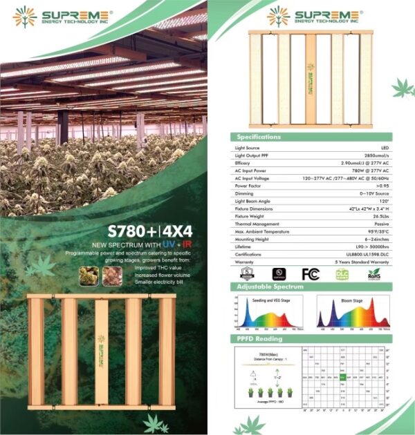 SpiderWise Superme S780 LED Grow Lights support to shorten the growth cycle of indoor garden plants, S780 provide full spectrum with mainly composed of red and blue light source to get best photosynthesis and obtain the best growth state. 2.9 umol/Watts Efficacy and total 2850 umol/s and 4X4Ft coverage with 980 Average PPFD at 1′ heights. full manufacture 5 Years Warranty.